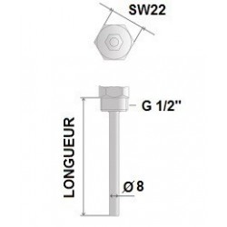 Ces doigts de gants, associés à une sonde de 6 mm de diamètre, sont utilisés dans de très grands nombres d'applications tant pour des mesures de température dans du liquide que du gaz. Ils vous permettent ainsi de démonter la sonde sans avoir à dévisser le doigt de gant, ce qui est particulièrement utile pour des applications sur des fluides liquides évitant ainsi la purge de l'ensemble du circuit. Leur utilité est également évidente Lorsque les sondes sont amenées à être étalonnées sur site, il suffit de dévisser légèrement la vis de maintien située sur le 6 pans, de sortir la sonde du doigt de gant pour l'introduire dans le four ou le bain d'étalonnage permettant ainsi la calibration complète de la chaine de, mesure en quelques instants. Caractéristiques techniques des sondes en laiton nickelé : Filetage 1/2 Gaz selon DIN EN 10226-1 (conique), longueur 50/100/250/200/250/300/350/400 mm, diamètre externe 8 mm, diamètre interne 6,5 mm, pression maxi. 16 bars, température maxi. 160 degrés Celsius, clé pour montage SW 22, vis de blocage latérale. Caractéristiques techniques des sondes en inox 1.4571 : Filetage 1/2 Gaz selon DIN 2999, longueur 50/100/250/200/250/300/350/400 mm, diamètre externe 8 mm, diamètre interne 6,5 mm, pression maxi. 40 bars en statique, température maxi. 400 degrés Celsius, clé pour montage SW 27, vis de blocage latérale. Les domaines d'utilisations traditionnels sont le chauffage, le génie climatique, le génie thermique, l'industrie etc....