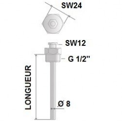 Ces doigts de gants avec raccord à bague, associés à une sonde de 6 mm de diamètre, sont utilisés dans de très grands nombres d'applications tant pour des mesures de température dans du liquide que du gaz. Grace au rtaccord à bague, l'étanchéité entre la sopnde de 6 mm et l'interne du doigt de bant est assurée. Ils vous permettent aussi de démonter la sonde sans avoir à dévisser le doigt de gant, ce qui est particulièrement utile pour des applications sur des fluides liquides évitant ainsi la purge de l'ensemble du circuit. Leur utilité est également évidente Lorsque les sondes sont amenées à être étalonnées sur site, il suffit de dévisser l'écrou du raccord à bague, de sortir la sonde du doigt de gant pour l'introduire dans le four ou le bain d'étalonnage permettant ainsi la calibration complète de la chaine de, mesure en quelques instants. Caractéristiques techniques des sondes en laiton nickelé : Filetage 1/2 Gaz selon DIN EN 10226-1 (conique), longueur 50/100/250/200/250/300/350/400 mm, diamètre externe 8 mm, diamètre interne 6,5 mm, pression maxi. 16 bars, température maxi. 160 degrés Celsius, clé pour montage SW 22. Caractéristiques techniques des sondes en inox 1.4571 : Filetage 1/2 Gaz selon DIN 2999, longueur 50/100/250/200/250/300/350/400 mm, diamètre externe 8 mm, diamètre interne 6,5 mm, pression maxi. 40 bars en statique, température maxi. 400 degrés Celsius, clé pour montage SW 24, . Les domaines d'utilisations traditionnels sont le chauffage, le génie climatique, le génie thermique, l'industrie etc....