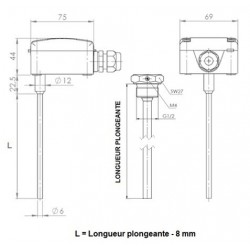Composé d'un doigt de gant 1/2" G en inox 1.4571 et d'une sonde lisse de 6 mm de diamètre dont la longueur est ajustée au doigt de gant cet ensemble permet de sortir la sonde encore raccordée à votre appareil de mesure de son support, évitant ainsi la vidange de la tuyauterie (pour par exemple étalonner la chaine complète en lieu et place). Le doigt de gant, ou plongeur, équipé d'une vis de blocage de sonde est disponible en longueurs 50, 100, 150, 200, 250, 300 ,350 et 400 mm. La sonde peut être équipée d'un élément résistif selon la liste suivante: PT100, PT1000, PT500, Ni1000, Ni1000TK5000, NTC1.8kOhm, NTC5kOhm, NTC10kOhm, NTC20kOhm, LM235Z, KTY81-210, KTY81-110, les versions Pt100 et Pt1000 sont disponibles en classe B (précision ± 0,3 degrés à 0 degrés Celsius), en classe A (précision ± 0,15 degrés à 0 degrés Celsius) et en classe 1/3 DIN B (précision ± 0,1 degrés à 0 degrés Celsius). La technologie filaire est au choix entre 2 fils, 3 fils ou 4 fils selon votre besoin. La plage de température admissible est de -30 à + 200 degrés pour la tige de la sonde et de -30 à +100 degrés pour le boitier. Celui-ci est IP65 en PA6 avec 1 presse étoupe M16x1,5 pour câble de 4 à 10 mm et des bornes de raccordements pour câble de 1,5 mm² maxi Caractéristiques techniques : Courant de mesure environ 1 mA, doigt de gant en inox 1.4571 avec filetage 1/2 " Gaz longueur 50, 100, 150, 200, 250, 300 ,350 et 400 mm, pression maxi 40 bars. Sonde diamètre 6 mm avec longueur adaptée au doigt de gant, boitier IP65 PA6, presse étoupe M16x1,5, gamme de température -30 + 200 degrés pour la tige de sonde. Les domaines d'utilisations traditionnels de ces capteurs sont le chauffage, le génie climatique, le solaire, le génie thermique, l'industrie etc.... Ces sondes sont produites en Allemagne
