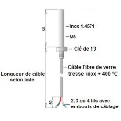 Sonde à visser M8x50 IP54 avec connecteur miniature. Thermocouple J FeCu-Ni. Longueur du câble au choix dans la liste. Températures de -50°C à +550°C