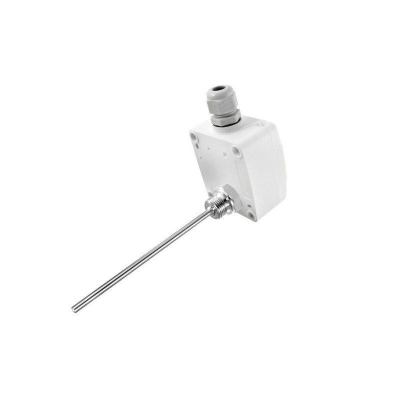 Composé d'un doigt de gant 1/2" G en laiton nickelé et d'une sonde lisse de 6 mm de diamètre dont la longueur est ajustée au doigt de gant, cet ensemble permet de sortir la sonde encore raccordée à votre appareil de mesure de son support, évitant ainsi la vidange de la tuyauterie (pour par exemple étalonner la chaine complète en lieu et place). Le boîtier est équipé d'un transmetteur en 0 10 V ou 4 20 mA avec une échelle ajustable par contact DIP. Le doigt de gant, ou plongeur, équipé d'une vis de blocage de sonde est disponible en longueurs 50, 100, 150, 200, 250, 300 ,350 et 400 mm. . La plage de température admissible est de -30 à + 150 degrés pour la tige de la sonde et de -35 à +100 degrés pour le boitier. Celui-ci est IP65 avec 1 presse étoupe pour l'entrée de câble avec des bornes de raccordements pour câble de 1,5 mm² maxi Caractéristiques techniques : Doigt de gant en inox 1.4571 avec filetage 1/2 " Gaz longueur 100, 150, 200, 250, 300 ,350 et 400 mm, pression maxi 40 bars. Sonde diamètre 6 mm avec longueur adaptée au doigt de gant, boitier IP65 , presse étoupe; gamme de température -30 / + 150 degrés pour la tige de sonde et -30 à + 70 degrés pour le boîtier. Caractéristiques du transmetteur : 24 plages de mesure sélectionnables par contact DIP. Précision transmetteur ± 0,3K + 3% PE. Raccordement en technologie 2 fils sur bornes maxi 1.5 mm². Alimentation 12-36DC, 24VAC pour la version 0-10 V, alimentation 12-36DC selon la charge pour la version 4-20 mA. Les domaines d'utilisations traditionnels de ces capteurs sont le chauffage, le génie climatique, le solaire, le génie thermique, l'industrie etc.... Ces sondes sont produites en Allemagne et sont livrées dans un emballage individuel avec une fiche technique (les versions françaises des fiches techniques sont téléchargeables sur notre site).