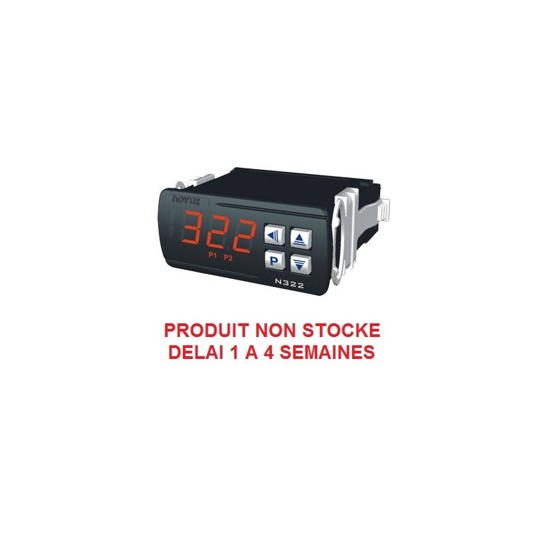 Cet appareil est un Indicateur thermostat électronique de température encastrable avec 2 relais de sortie qui se raccorde à une sonde de type thermocouple J, K ou T. Affichage degré C ou F, règlage d'offset de capteur. Il indique les messages d'erreurs de mesure hors gamme, et de rupture ou court circuit de la sonde. Fonction calibration et mot de passe. Caractéristiques techniques : Alimentation 100 à 240 Vac ( ± 10 %) / 50 60 Hz./ 5 VA. Entrée capteur type thermocouple avec : Thermocouple J : Echelle: 0 à 600 degrés Précision : ±3 degrés ; compensation de soudure froide, Thermocouple K : Echelle: -50 à 1000 degrés Précision : ±3 degrés ; compensation de soudure froide, Thermocouple T : Echelle: -50 à 400 degrés Précision : ±3 degrés ; compensation de soudure froide. . Résolution 0.1: de ?19.9ºC à 199.9ºC et 1 degré ailleurs. 1 Relais SPDT 10A/250 Vac et 1 relais SPST 3A/250 Vac.- Fonctionnement : 0 à 40 degrés - Stockage : -20 à 60 degrés - Humidité relative : 20 à 85% sans condensation Boîtier : Polycarbonate UL94 V-2. Raccordement: 4,0 mm² maximum. Protection : IP65 face avant / IP 42 boîtier. Dimension : 74 x 32 x 75 mm. Poids : ~ 110 g. Découpe : 70 x 29 mm
